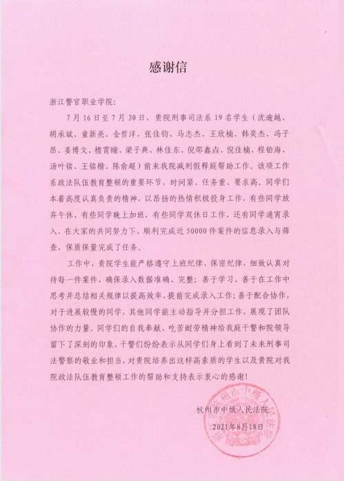 同學們甘于奉獻、吃苦耐勞的精神狀态給杭州市中級人民法院的幹警和院領導留下了深刻的印象。在任務結束後,杭州市中級人民法院專程向我院送來感謝信。